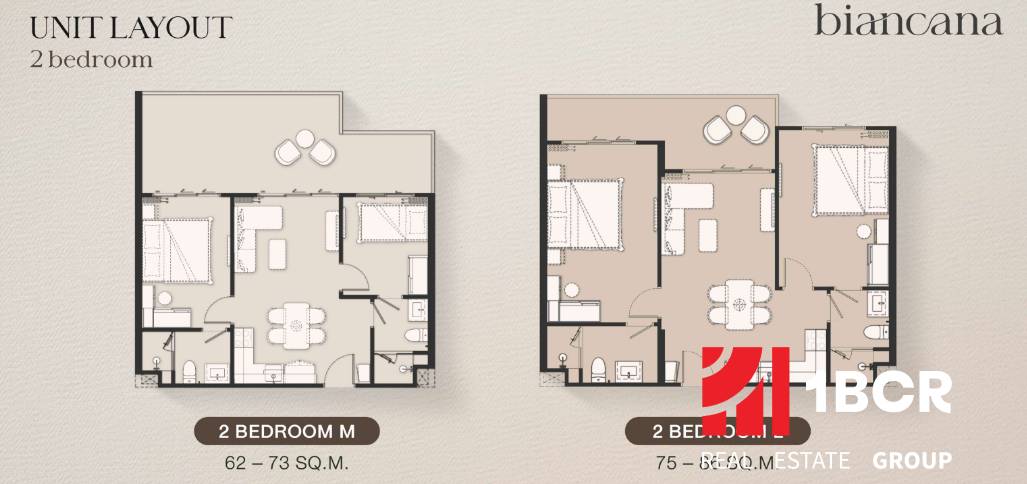 We offer 2-bedroom apartments with a well-designed layout that includes two separate bedrooms, a living area connected to the kitchen, a dining corner, and a bathroom. The master bedroom features its own en-suite bathroom, while the second bedroom has access to a bathroom that can also be entered from the living area. The apartment also comes with a spacious balcony. The units are sold in a partially furnished standard, providing an ideal foundation for comfortable living as well as holiday use.