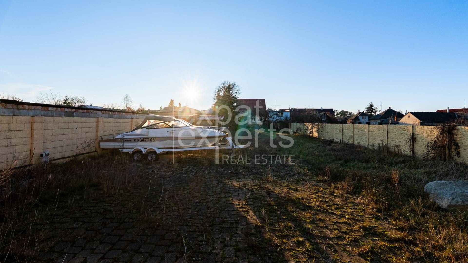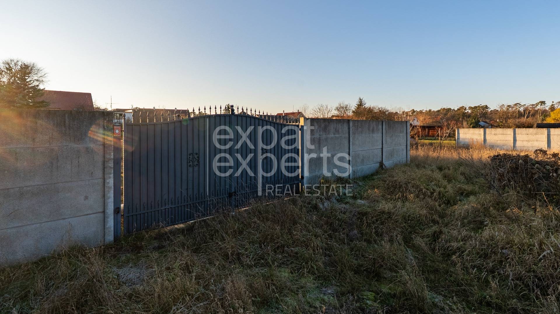 The plot is 2/3 fenced with a high concrete fence. The existing electric gate can be moved and used for a new entrance to the plot.