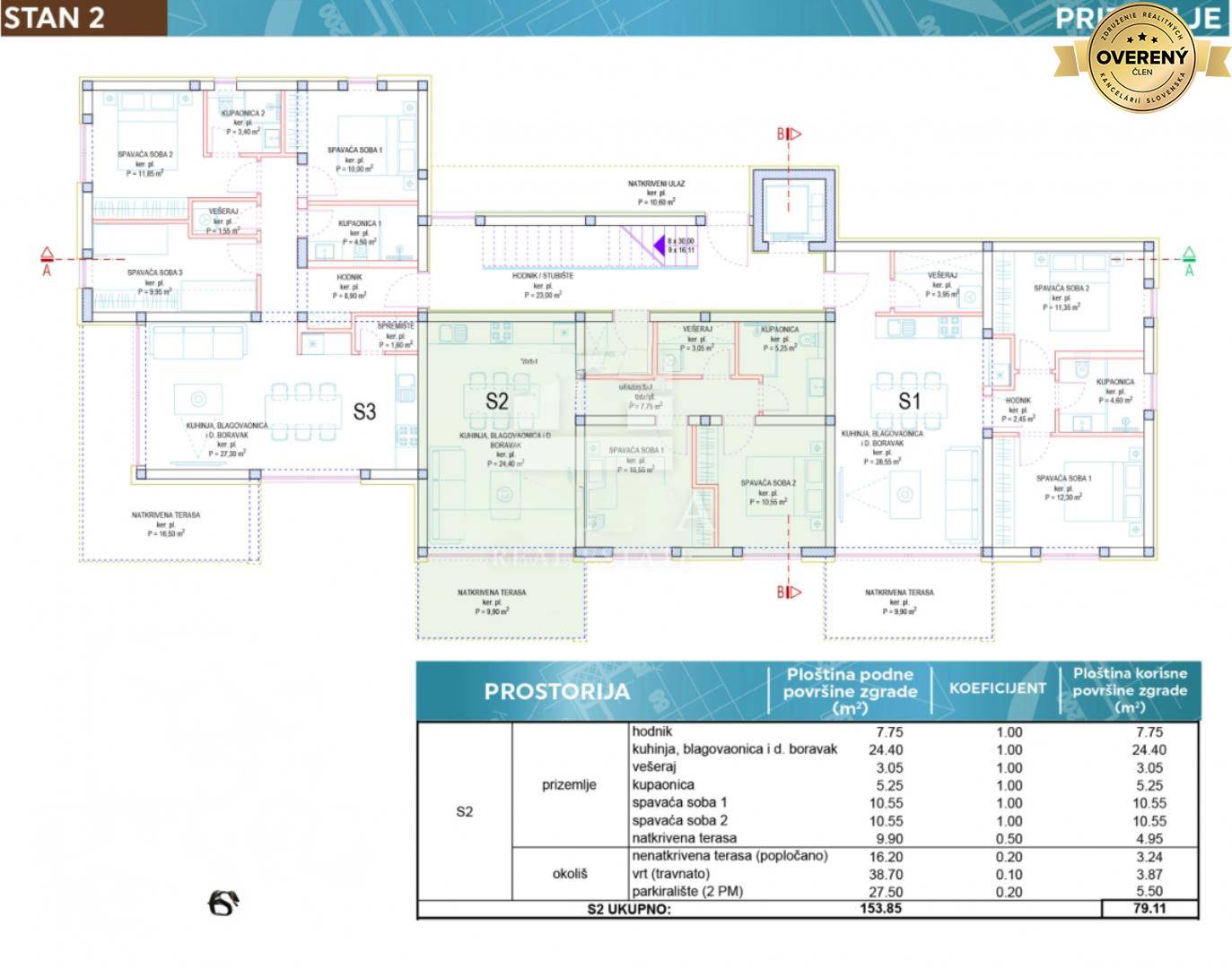Apartment S2 is located on the ground floor. The area of the apartment is 61.55 m2 + partially covered terrace 16.20 m2 + garden 38.70 m2.