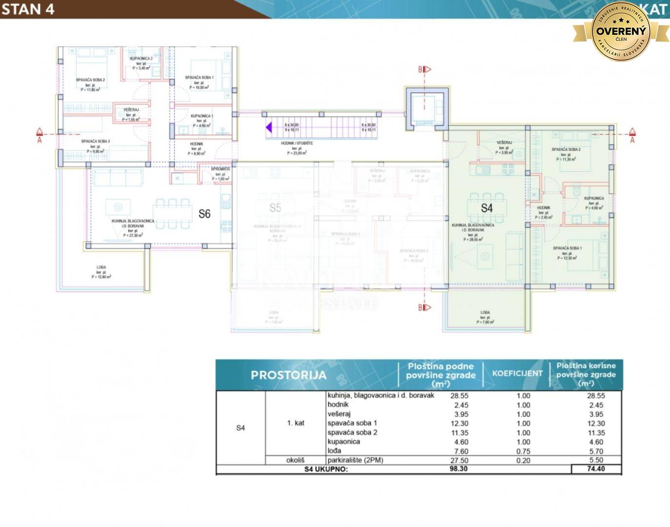 Apartment S4 is located on the 1st floor. The area of the apartment is 63.20 m2 + loggia 7.60 m2.