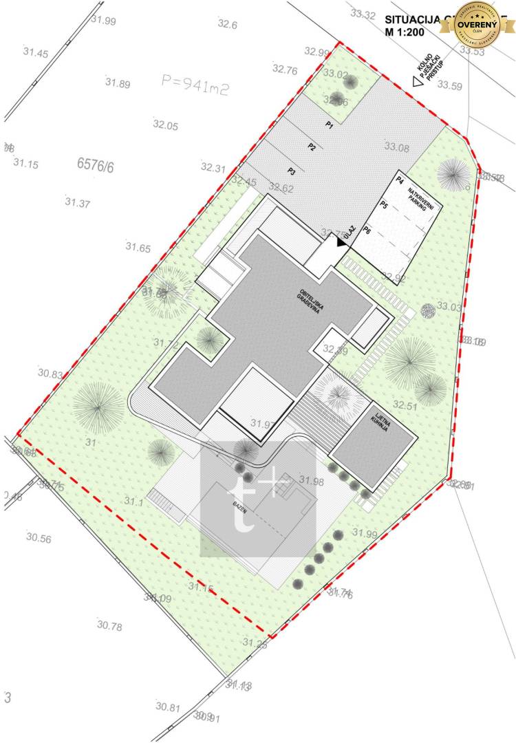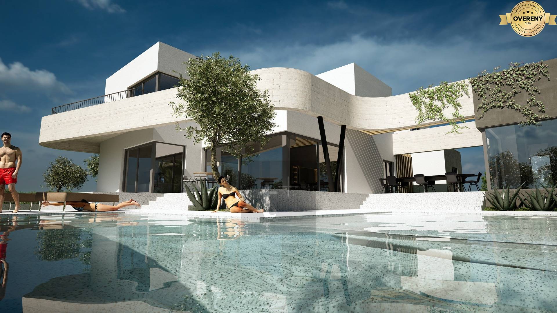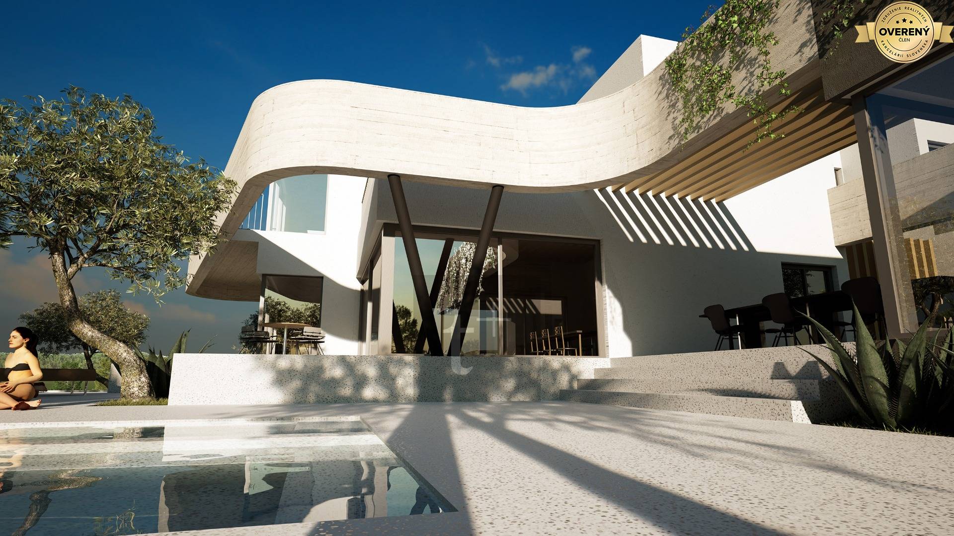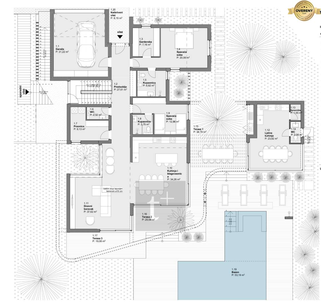 The villa stands on a plot of land with an area of 1500 m2. The usable area of the villa is 460 m2 + several terraces and a summer kitchen. There is a swimming pool with an area of 53 m2 on the plot. In front of the entrance to the house there is a parking area with a shelter for 3 cars.