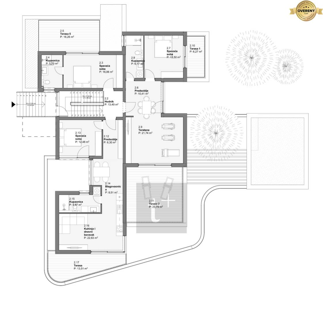 The first floor of the villa has an area of 142.86 m2 + 4 terraces.