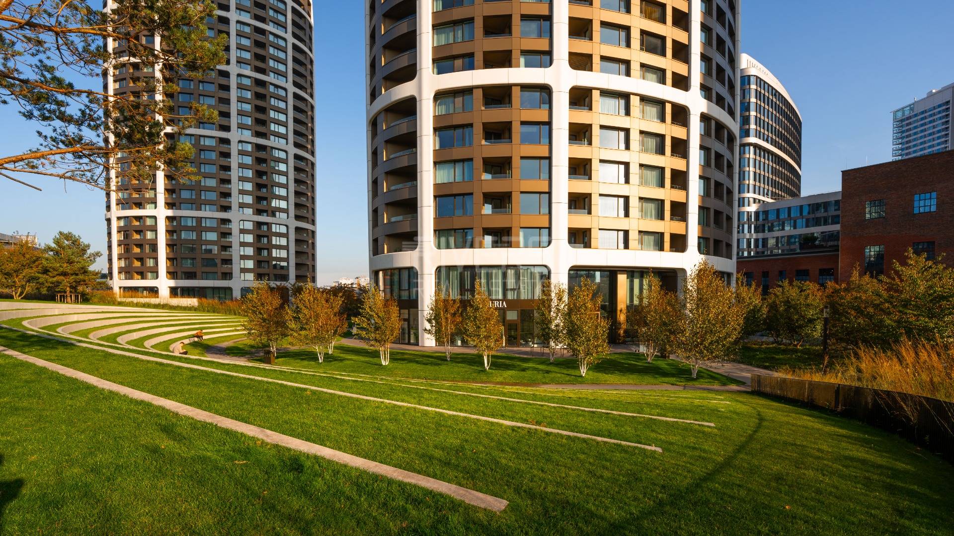 The building is equipped with four passenger elevators, each with a minimum capacity of 13 people. The window frames are made of aluminum profiles with triple-glazed insulating glass. Heating is provided by panel radiators supplied via a central system. Residential rooms are cooled using circulating units connected to a central cooling source. Ventilation is handled through central units with heat recovery. The building’s energy certificate rates it in class A0.