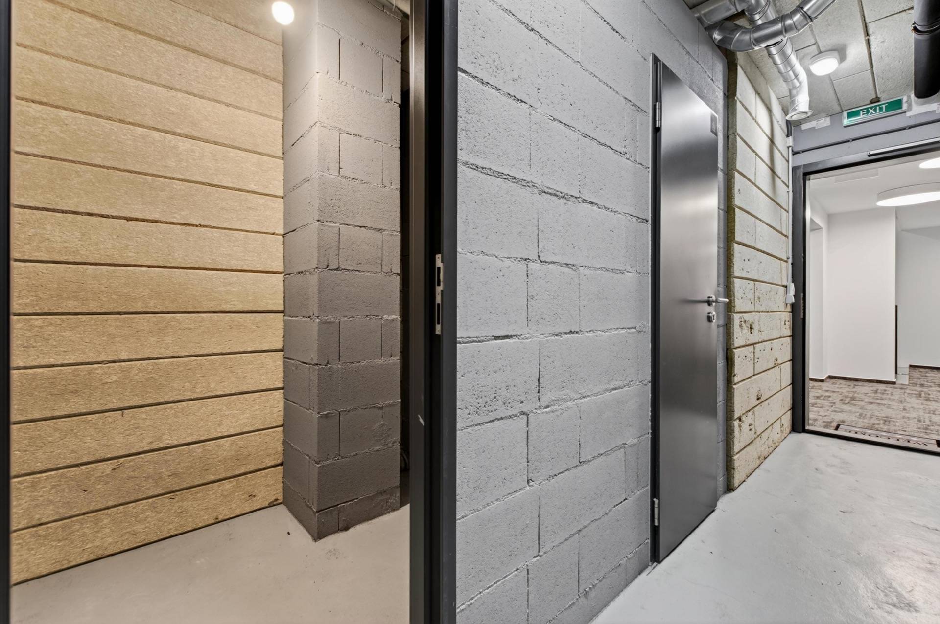 The apartment comes with a brick cellar (2.43 m²) and two parking spaces — one indoor garage space and one outdoor space directly in front of the building.