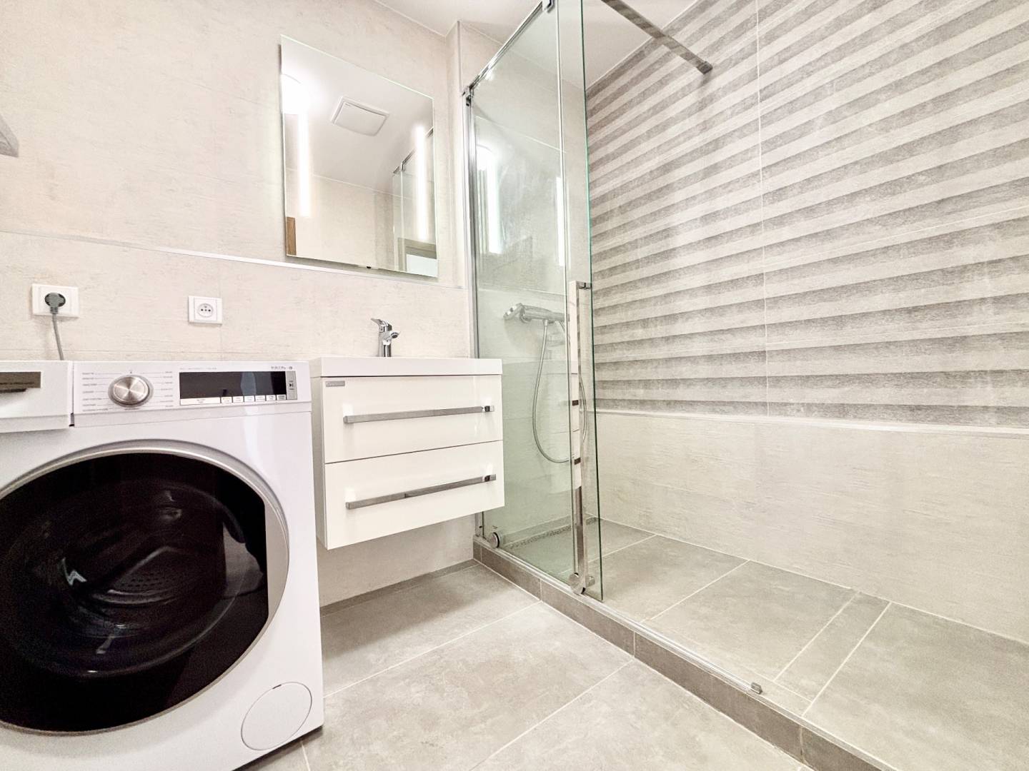 Real estate agency The Home offers for rent a spacious sunny 1-bedroom apartment in the new building TEHELNÉ POLE on Bajkalská street. The apartment is located on the 6th floor, is oriented to the west towards the football stadium and modified with an area of 50 m2. The layout consists of an entrance hall furnished with a built-in wardrobe, a bedroom with a built-in wardrobe, a living room connected to the kitchen and a separate toilet and a separate bathroom with a shower. The apartment is rented completely furnished. The kitchen is equipped with built-in appliances - refrigerator with freezer, dishwasher, microwave, induction hob, electric oven, hood. There is a washing machine in the bathroom. A big bonus is the underfloor heating throughout the apartment, above-standard ceiling cooling and electric outdoor blinds. Along the whole apartment there is a loggia with a beautiful view with an area of 12 m2.
