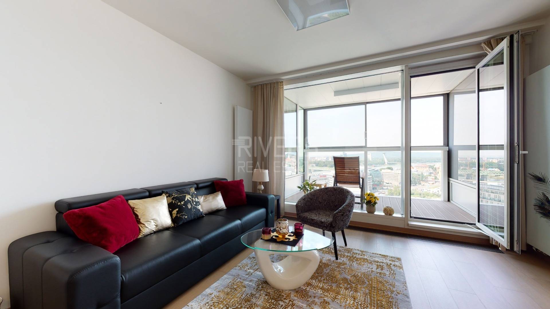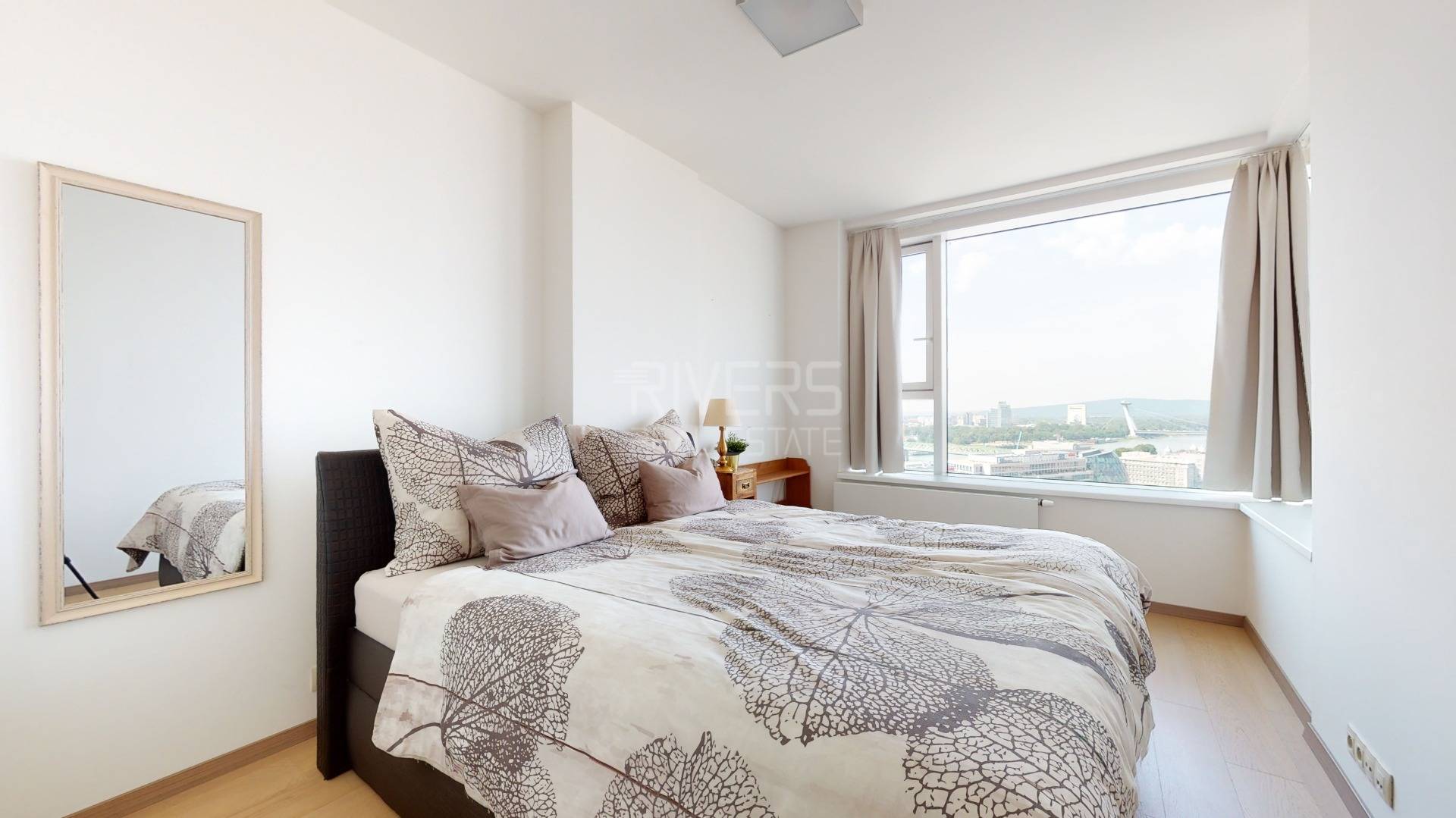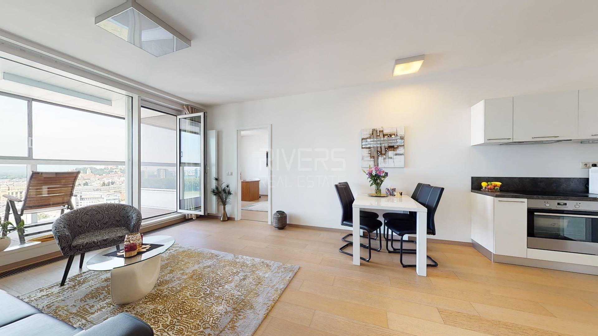 The RIVER REAL ESTATE agency offers for sale a modern apartment with two bedrooms in the Panorama City project. It captivates with stunning views from the 20th floor of Bratislava Castle, the Danube River, and the Old Town.