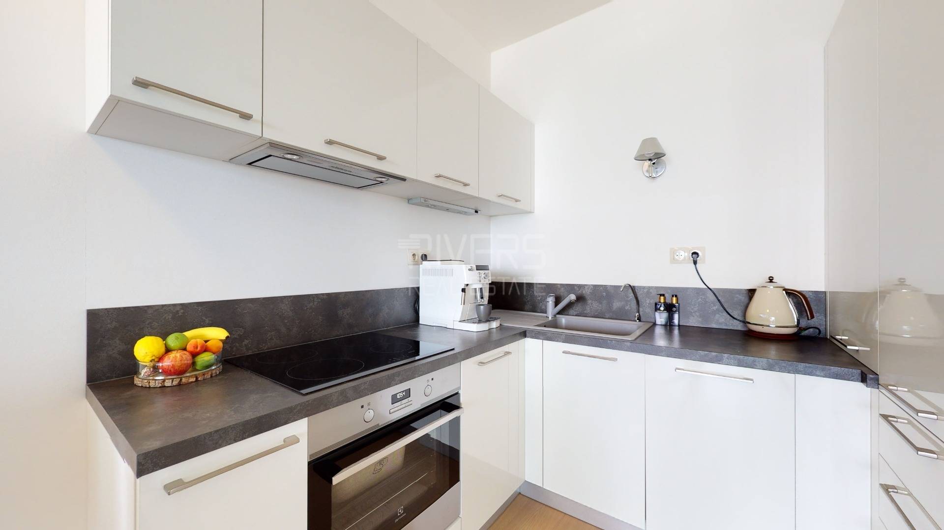 ✅ I appreciate the timeless design of the custom-built furniture and tailor-made kitchen in white, fully equipped with all appliances.