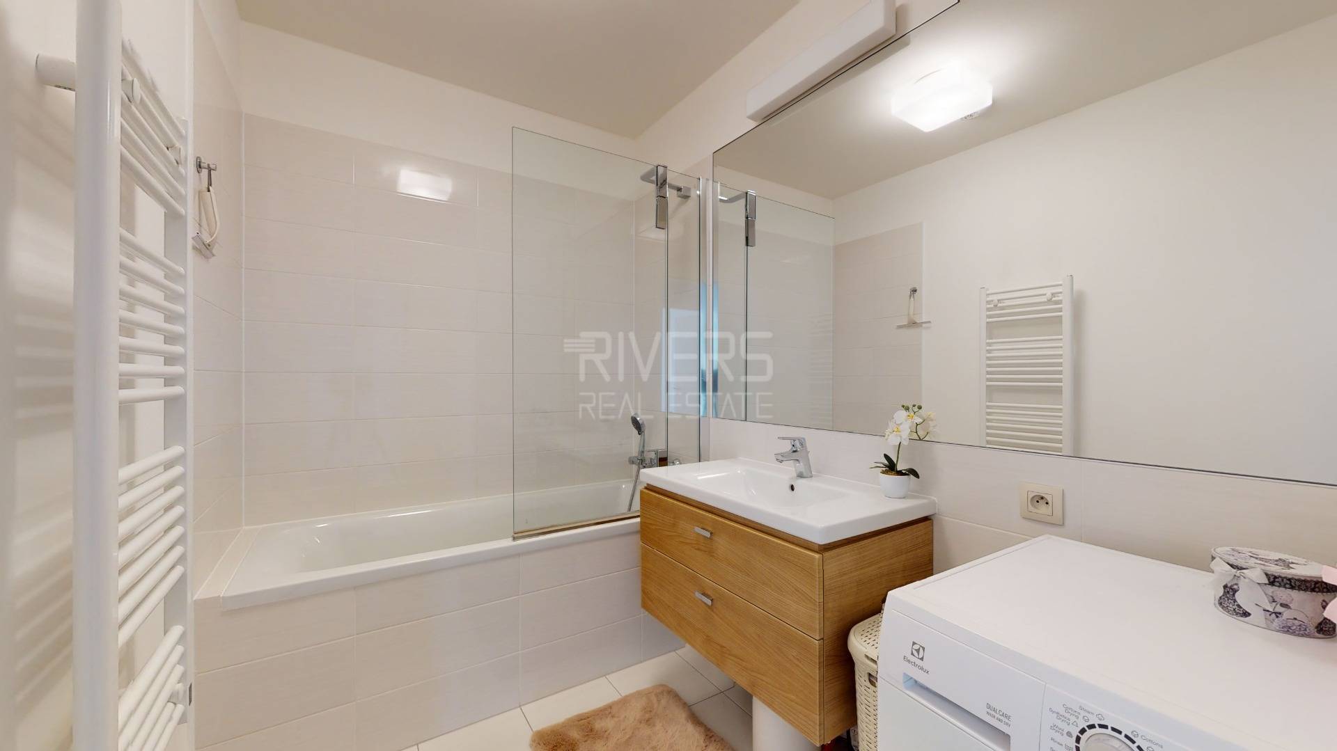 • Wooden floors, frameless interior doors, bathroom with high-quality sanitary fittings and tiling – upgraded standard by the developer including glass elements, high-quality kitchen with premium-class appliances, separate toilet, ample storage space, glazed loggia