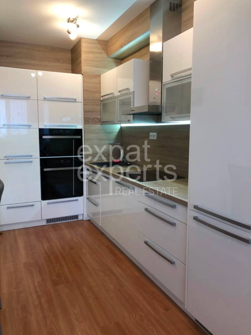 The apartment is rented partially furnished with a fully equipped kitchen with built-in appliances (fridge with freezer, microwave, stove, ceramic oven, extractor hood). It offers everything you need for comfortable living; plenty of storage space, air conditioning, and a loggia.