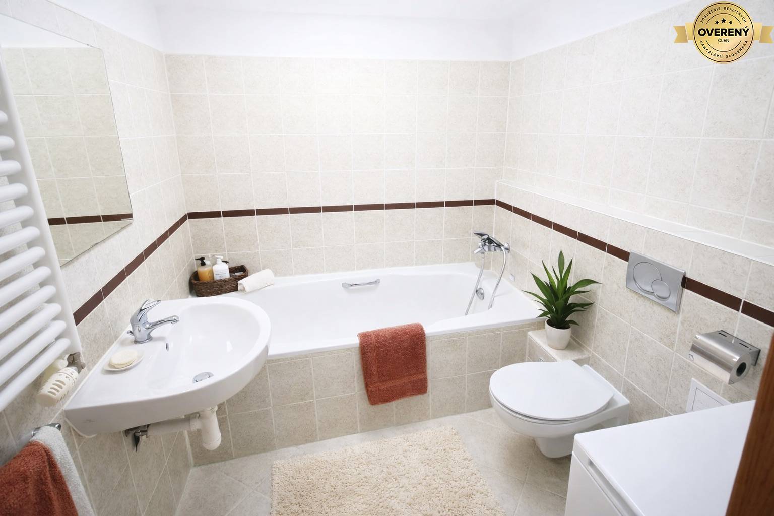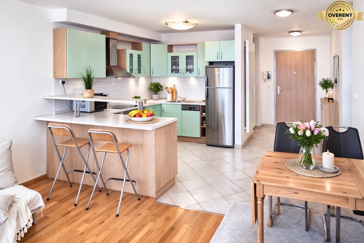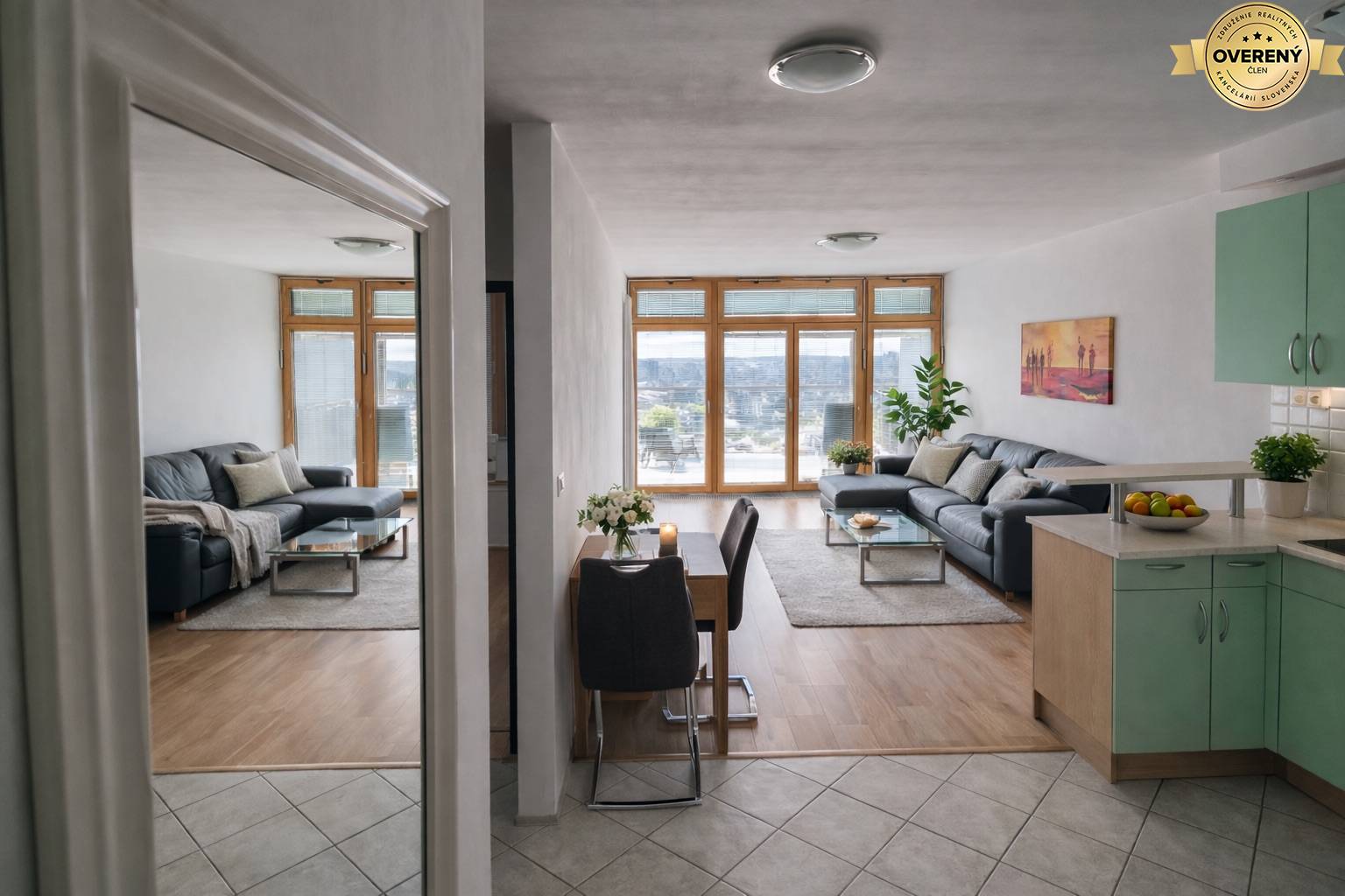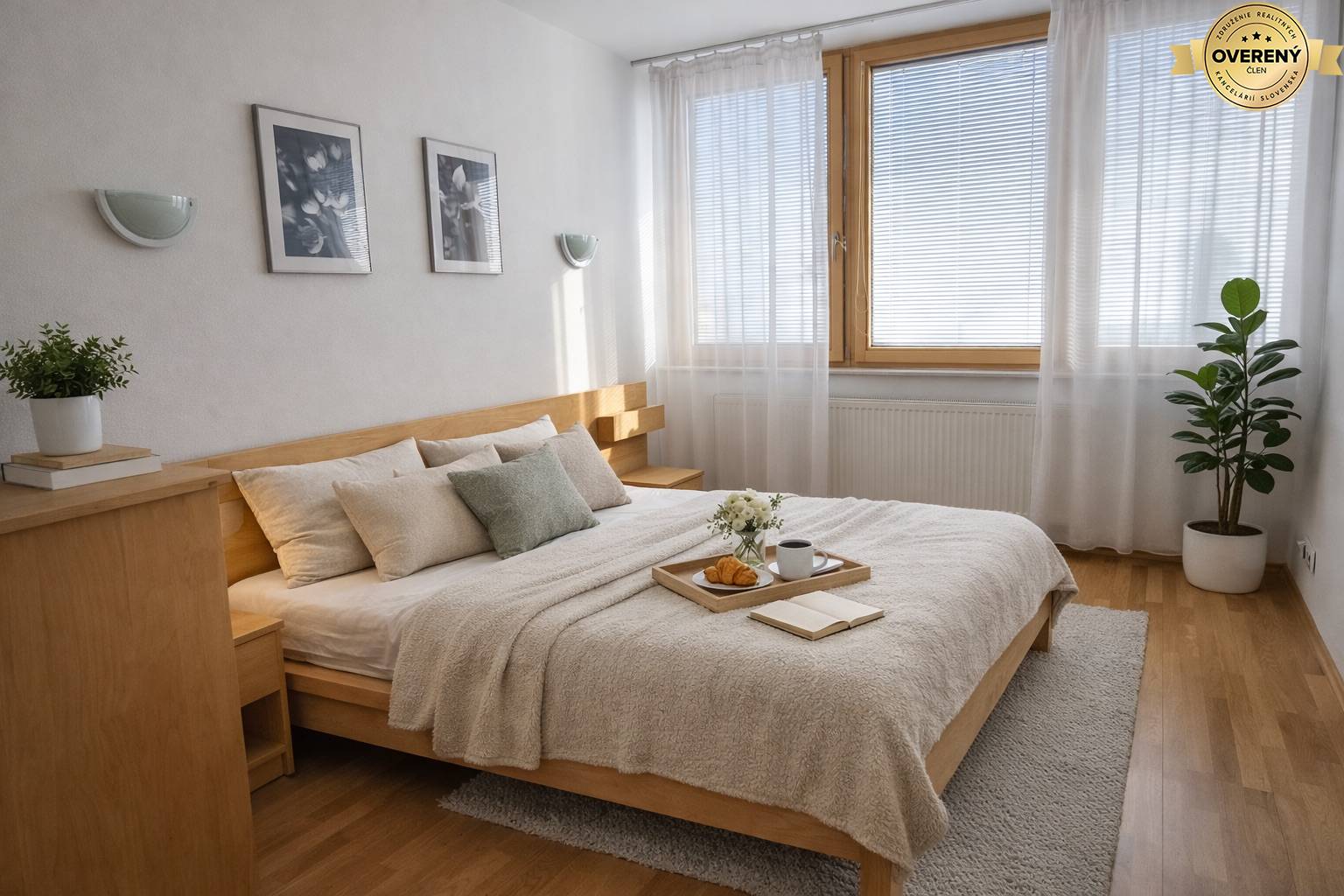 The apartment is furnished with high-quality materials – wooden triple-glazed windows with built-in internal blinds, wooden floors in the living areas and modern tiling in the kitchen, hallway and bathroom. The apartment building has a 24-hour reception.