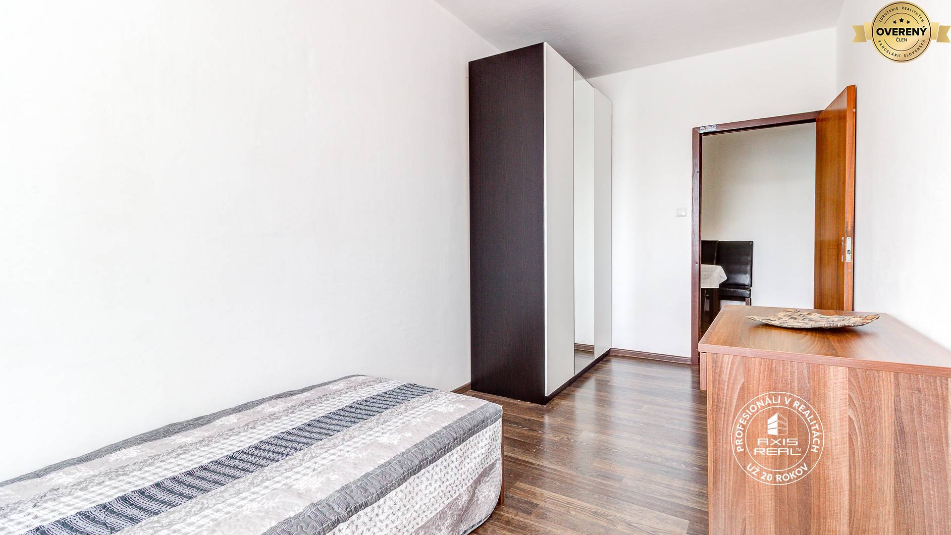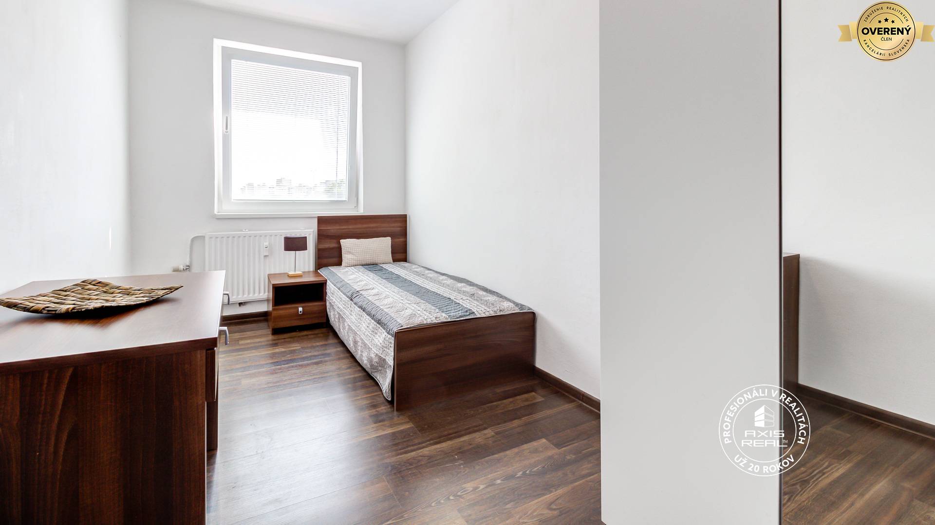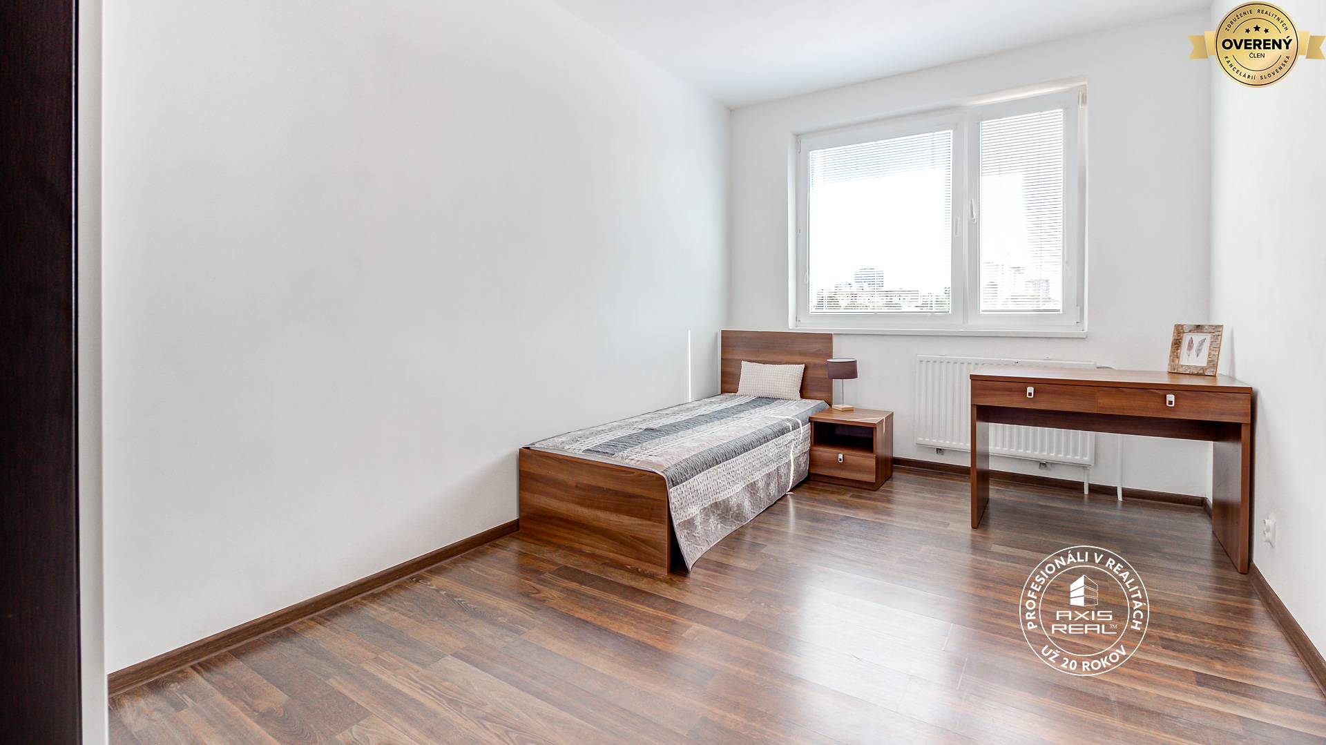The AXIS REAL agency exclusively offers for rent a furnished 4-room apartment in the BA V. part, Petržalka, on Röntgenova street, near DIGITAL PARK. Available immediately. Monthly rent is 990EUR plus energies/utilities monthly prepayments from 250EUR (depending on the number of tenants). This spacious renovated apartment with a total area of 86 m2 (of which the loggia is approx. 5 m2) is located on the 4th floor in an apartment building with an ELEVATOR of a total of 8 floors. The apartment consists of a spacious entrance hall, a separate kitchen, a living room, and 3 separate bedrooms. All rooms are NON-WALK-THROUGH. The modern bathroom comes with a shower; the toilet is a separate unit. The loggia with an entrance from the kitchen is also renovated. Appliances: washing machine, gas stove with oven, refrigerator with freezer. There is also a storage cellar available.