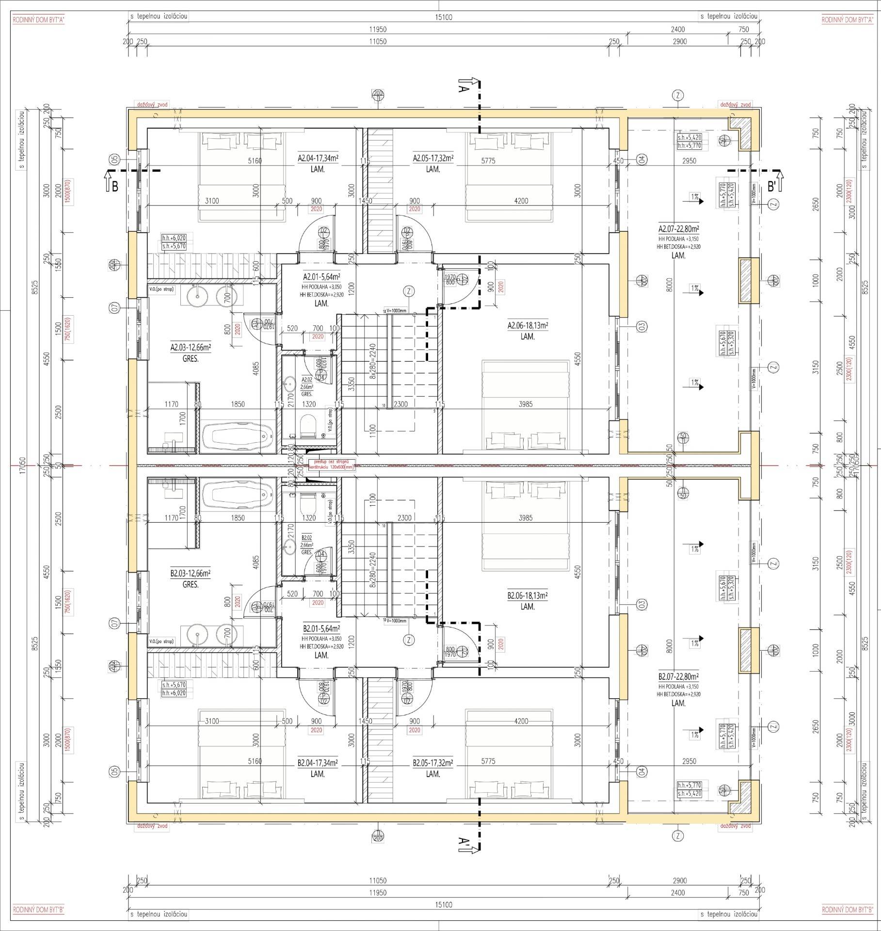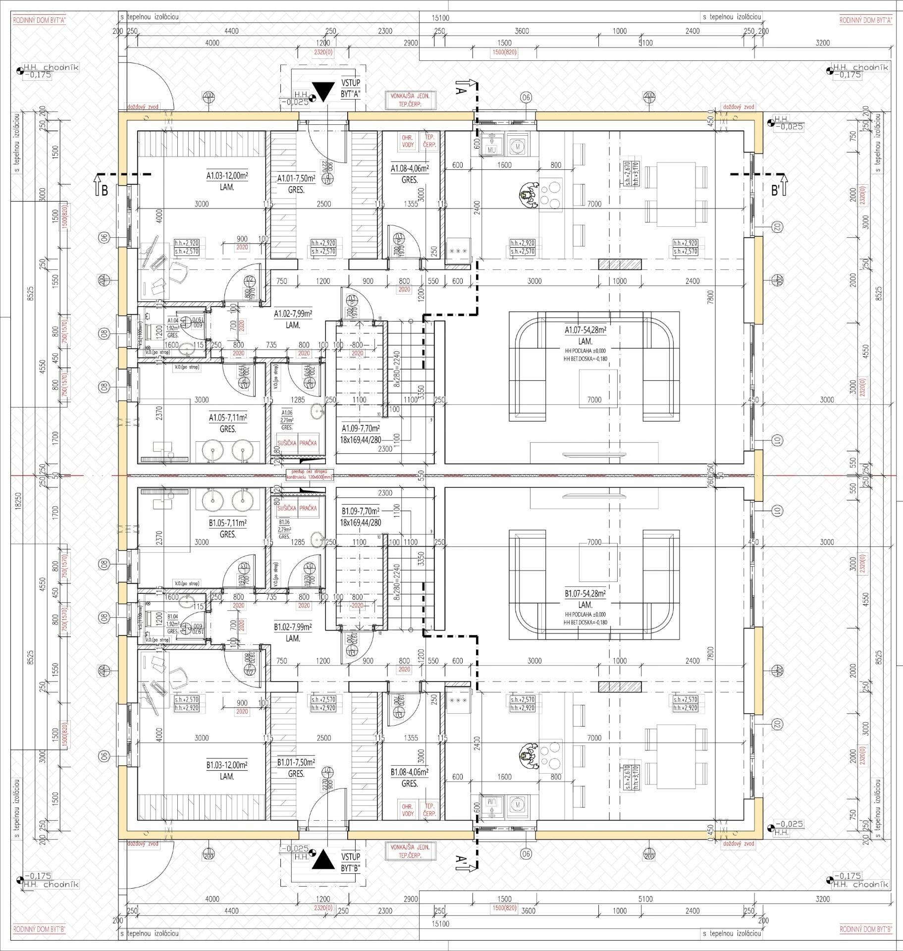 The house is constructed of brick (30 cm, perimeter walls 50 cm including insulation) with an insulated exterior façade. The roof is flat with high-quality waterproofing. Heating is provided electrically via a heat pump. Wastewater is managed by a private septic tank. Each residential unit has its own well with a pump.
