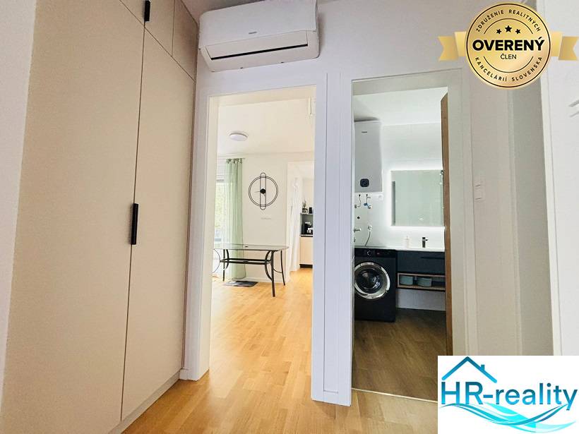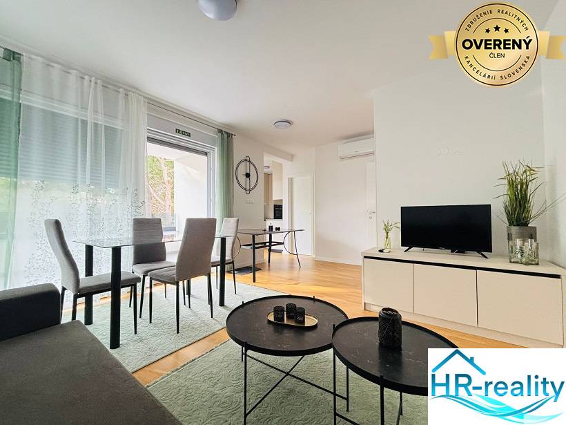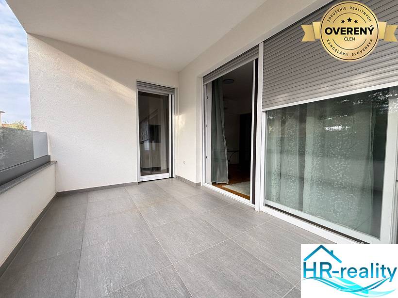This modern new building is located only about 400 meters from the main city beach. It consists of a total of six apartments. Apartment A1 is located on the 1st floor of the apartment building and consists of a hallway, living room with dining area and kitchen, pantry, toilet, bathroom with toilet, 2 rooms with a total usable area of 59.10 m2, as well as a covered terrace with a total usable area of 9.85 m2 and a parking space marked PM4 with an area of 12.80 m2 and PM5 with an area of 13.20 m2. In front of the building there is a shared heated and massage pool with dimensions of 8.5 x 4 meters. Top quality construction: apartments have parquet floors, electric roller shutters, three air conditioners per apartment installed in the living room and bedrooms.