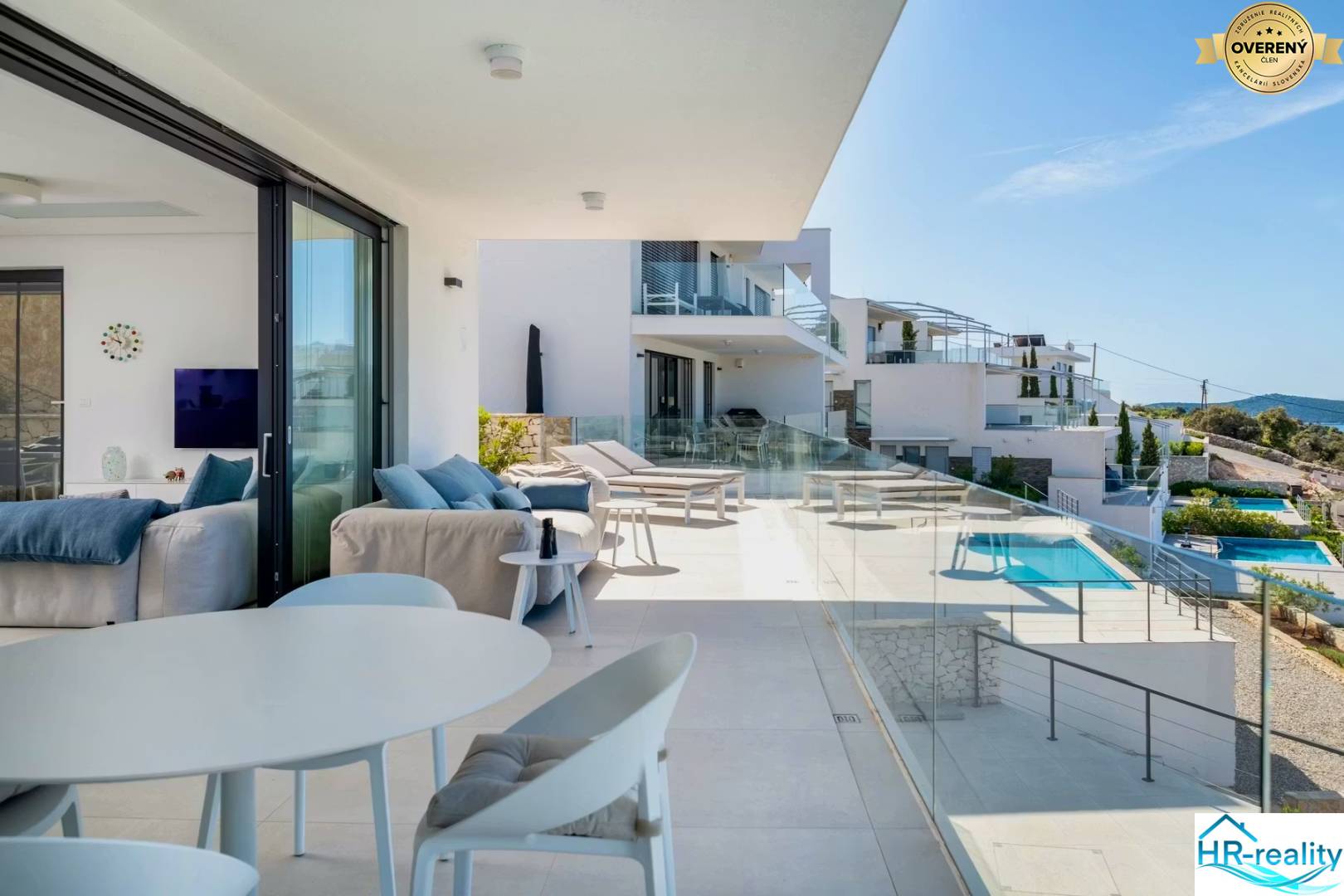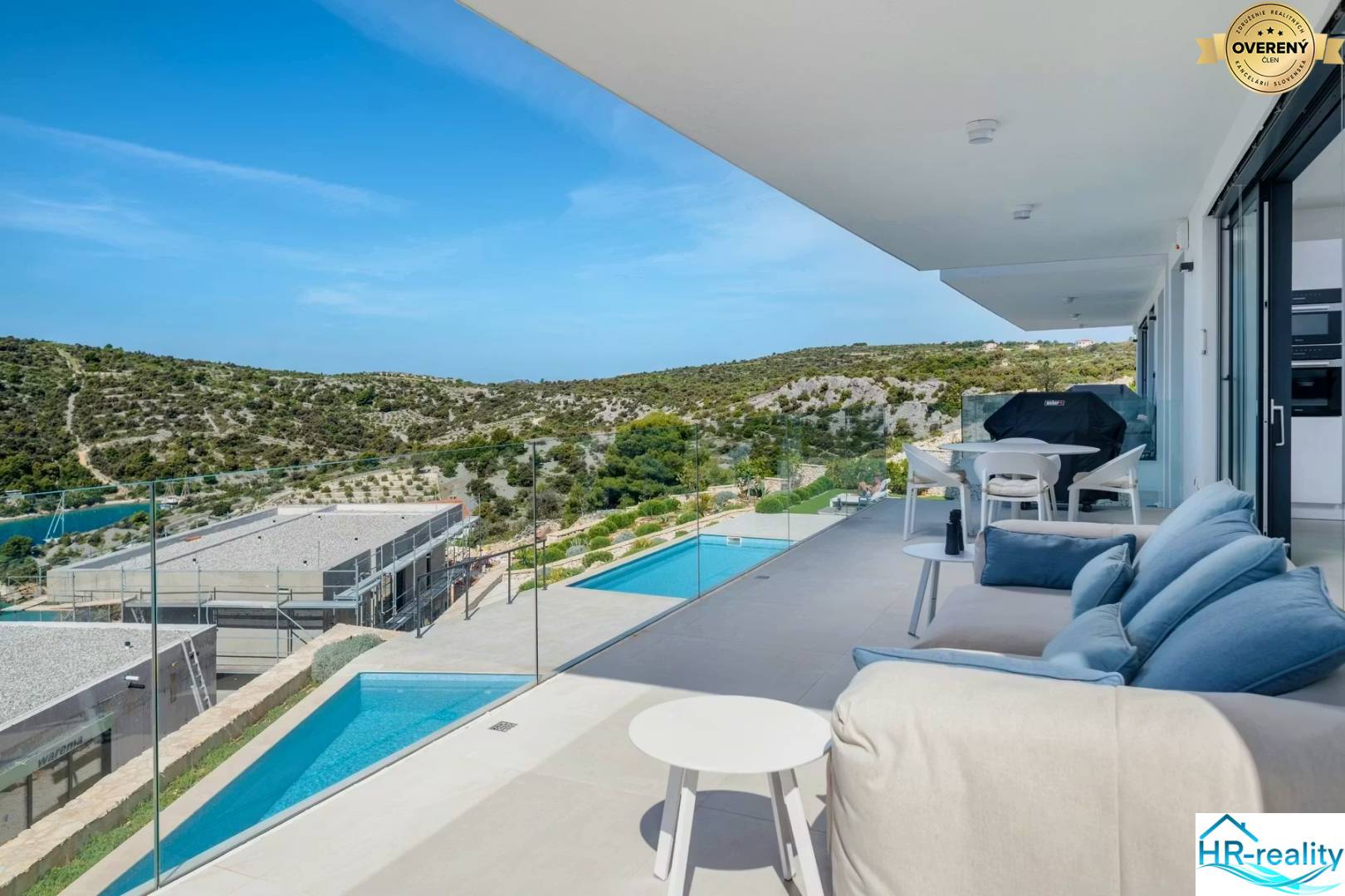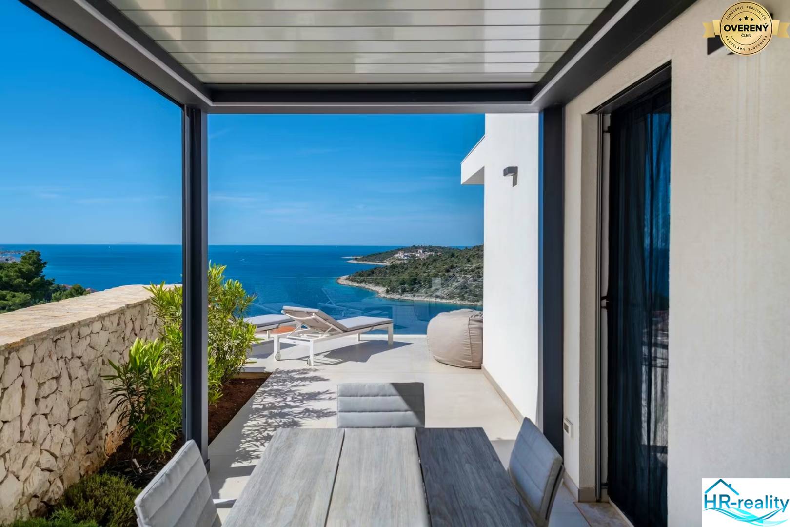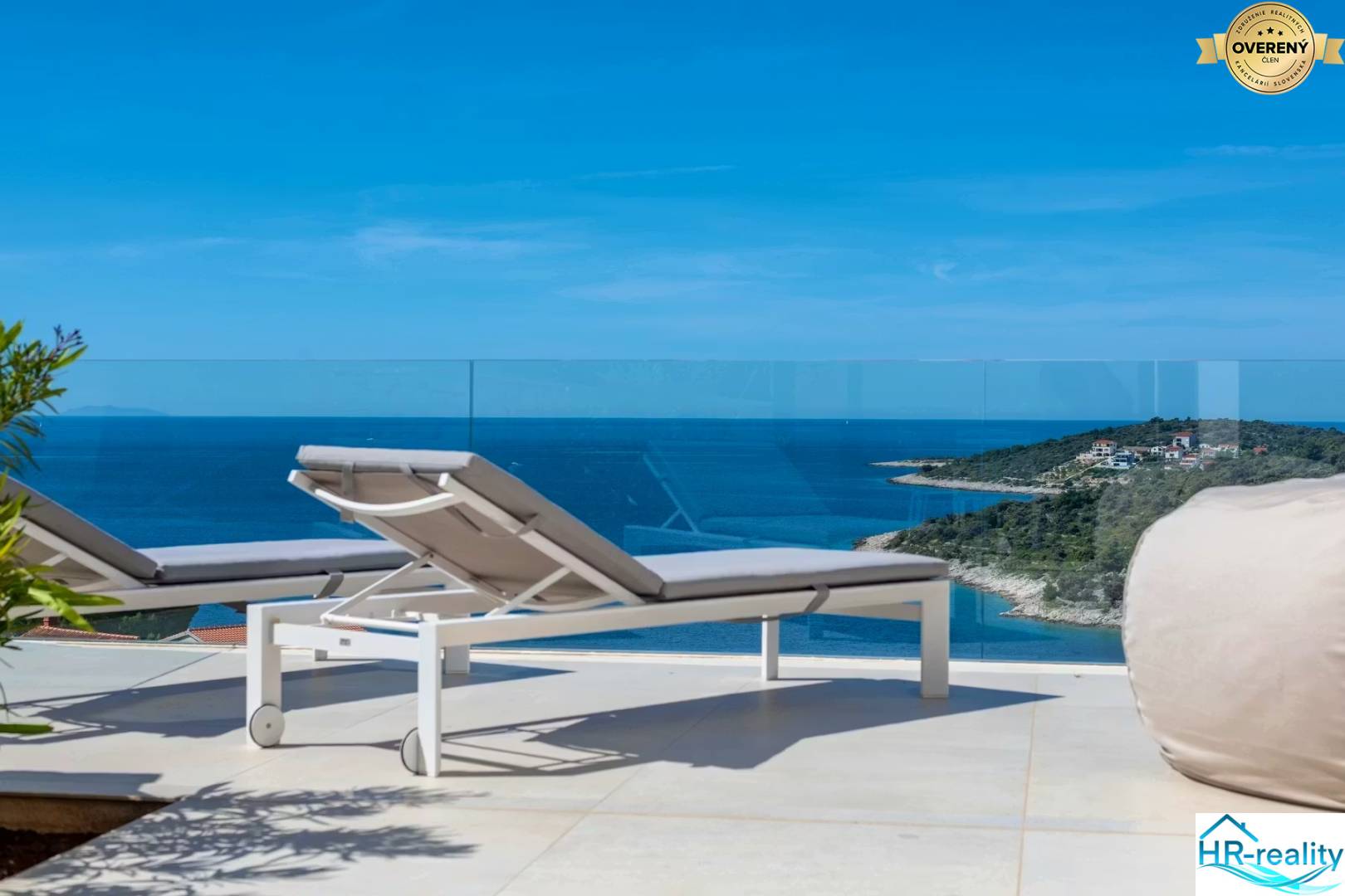 A partially covered terrace with an elegant glass railing offers an unobstructed and impressive view of the sea and the surrounding islands.