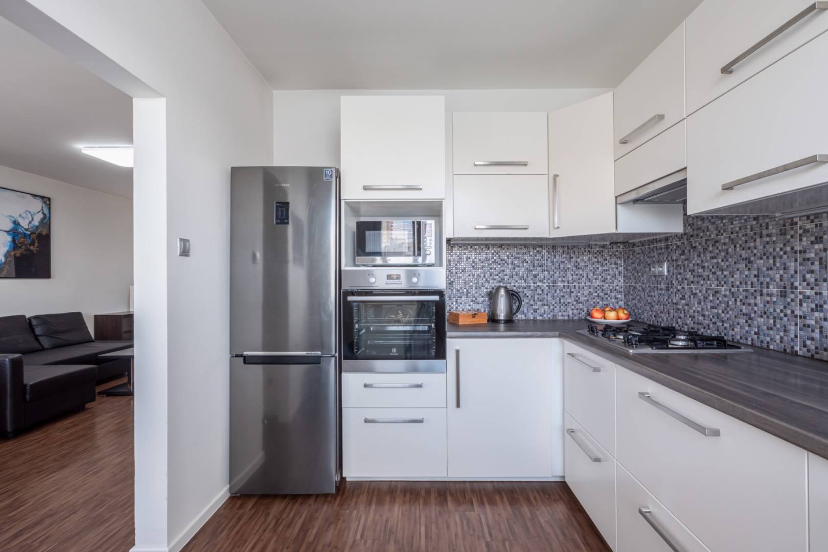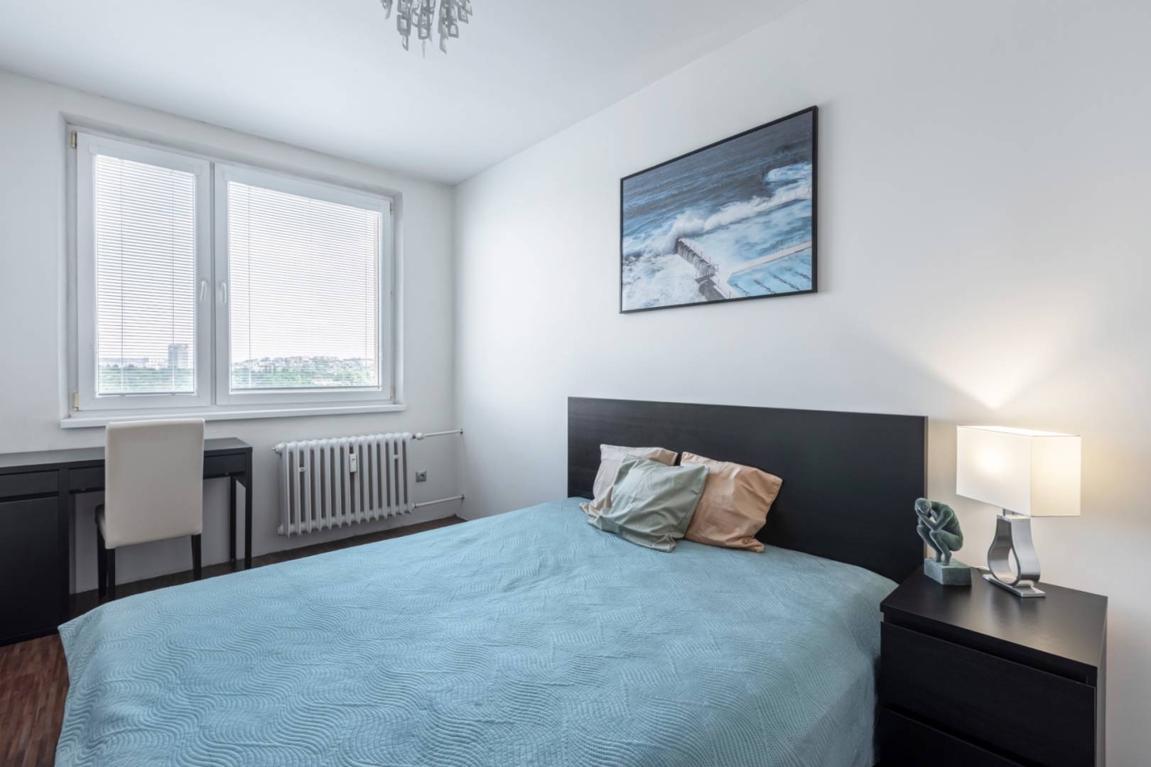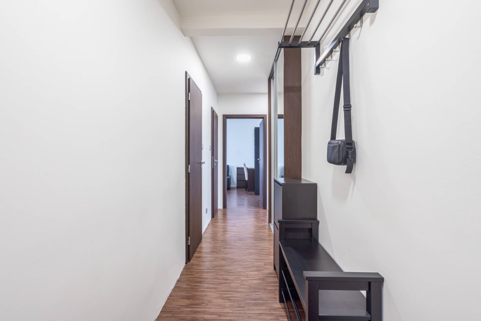 The living room with a loggia is spacious and offers space for a dining table and a work corner. The bedroom has its own loggia, facing east, which is perfect for a morning coffee with a view of the Castle and the Danube. The third room can serve as a children's room or office and is equipped with a practical wardrobe.