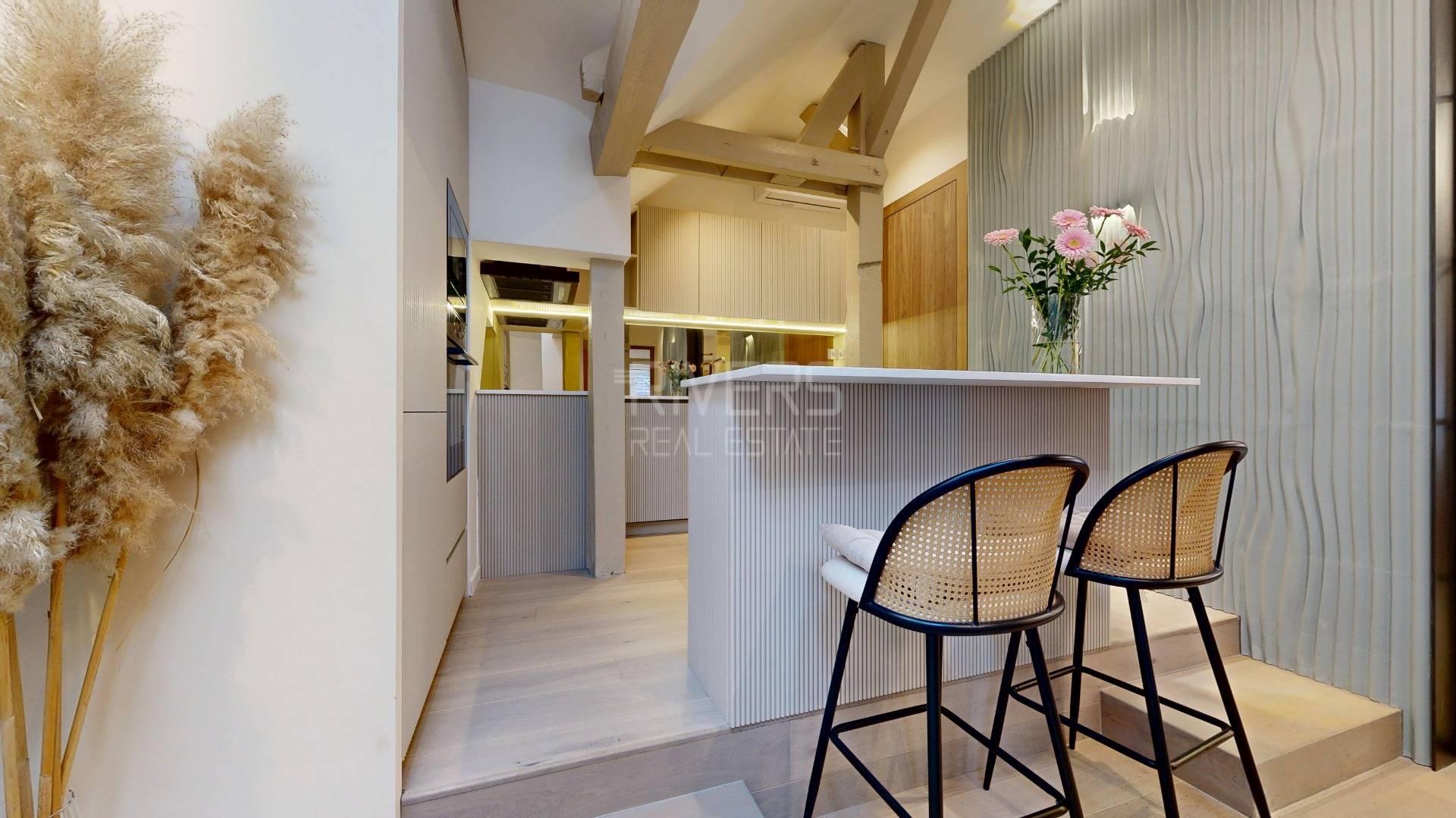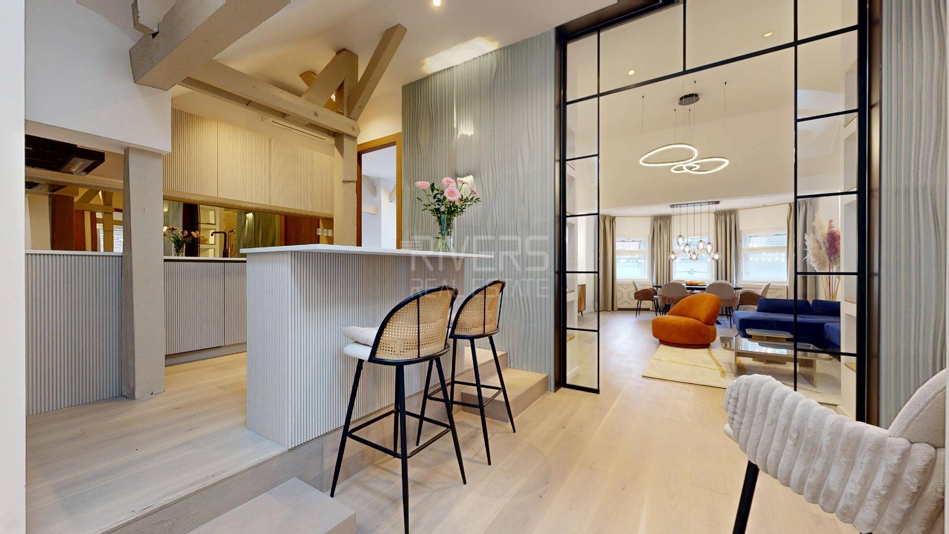 The interior impresses at first glance—exposed wooden beams, a carefully selected color palette, premium materials, and meticulous craftsmanship create an elegant yet welcoming space with a distinctive atmosphere. High ceilings and a thoughtfully designed layout enhance the sense of openness and comfort, meeting the expectations of even the most discerning clientele.